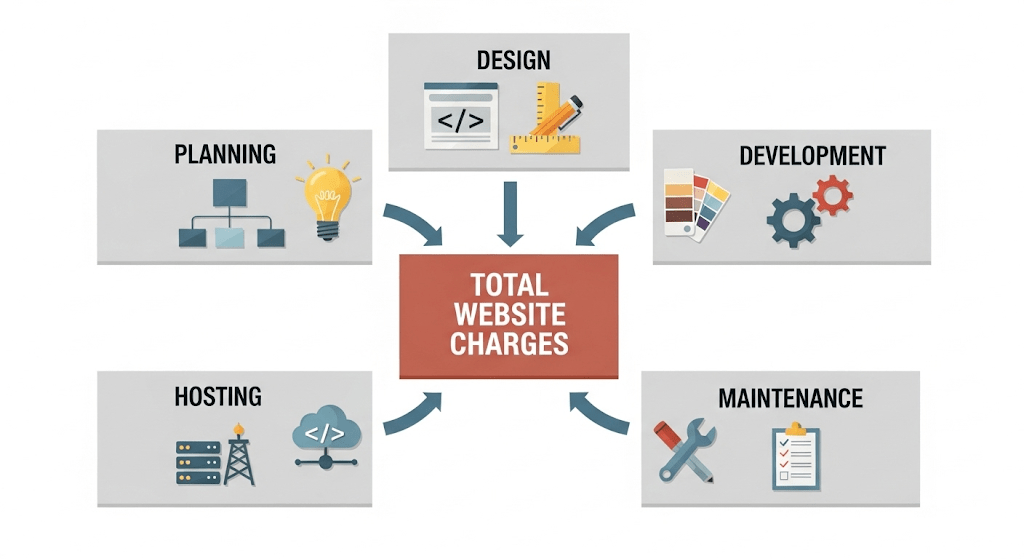 Website development charges are the total fees required to design, build, host, and maintain a website, including one-time and recurring costs.